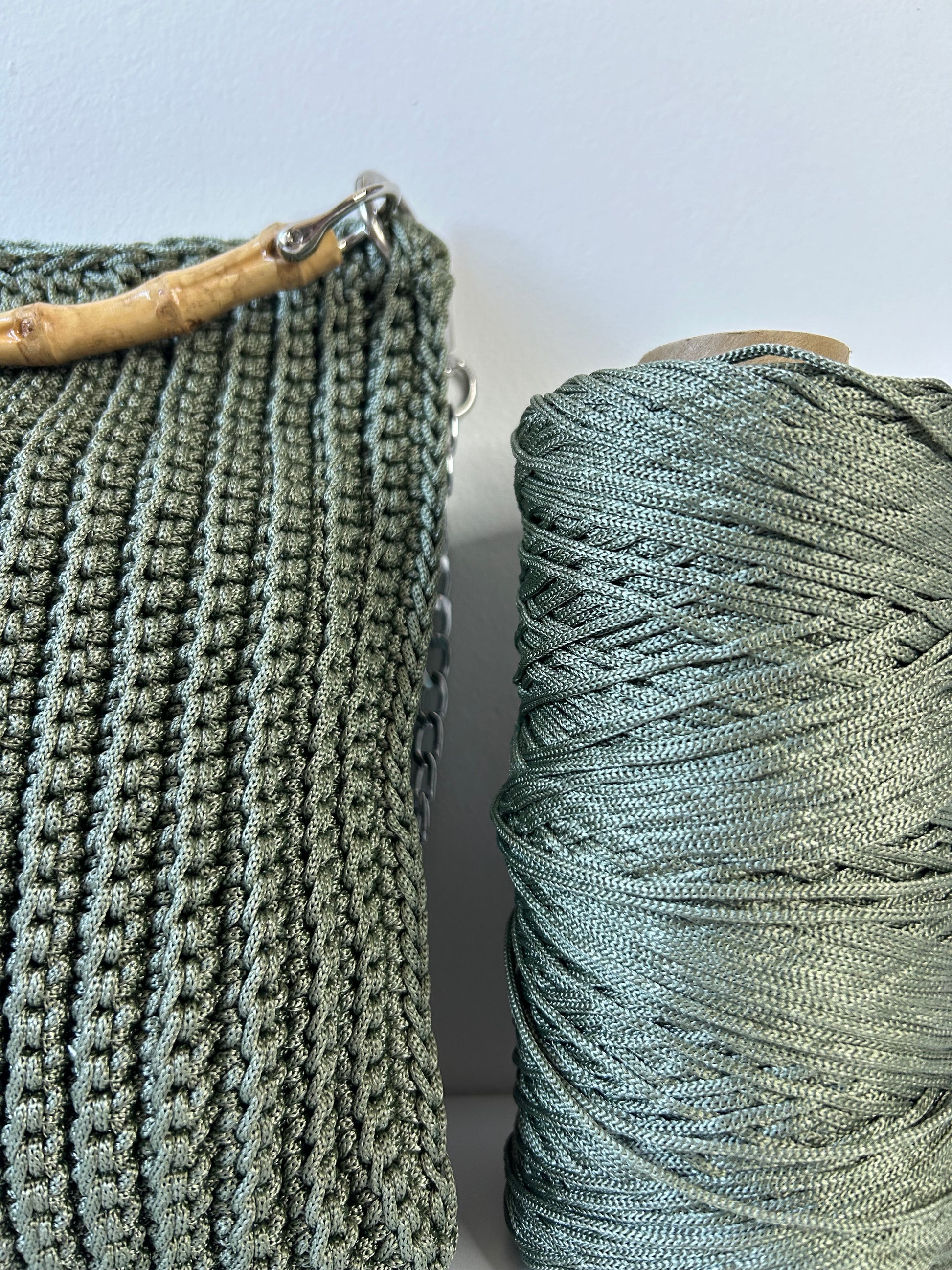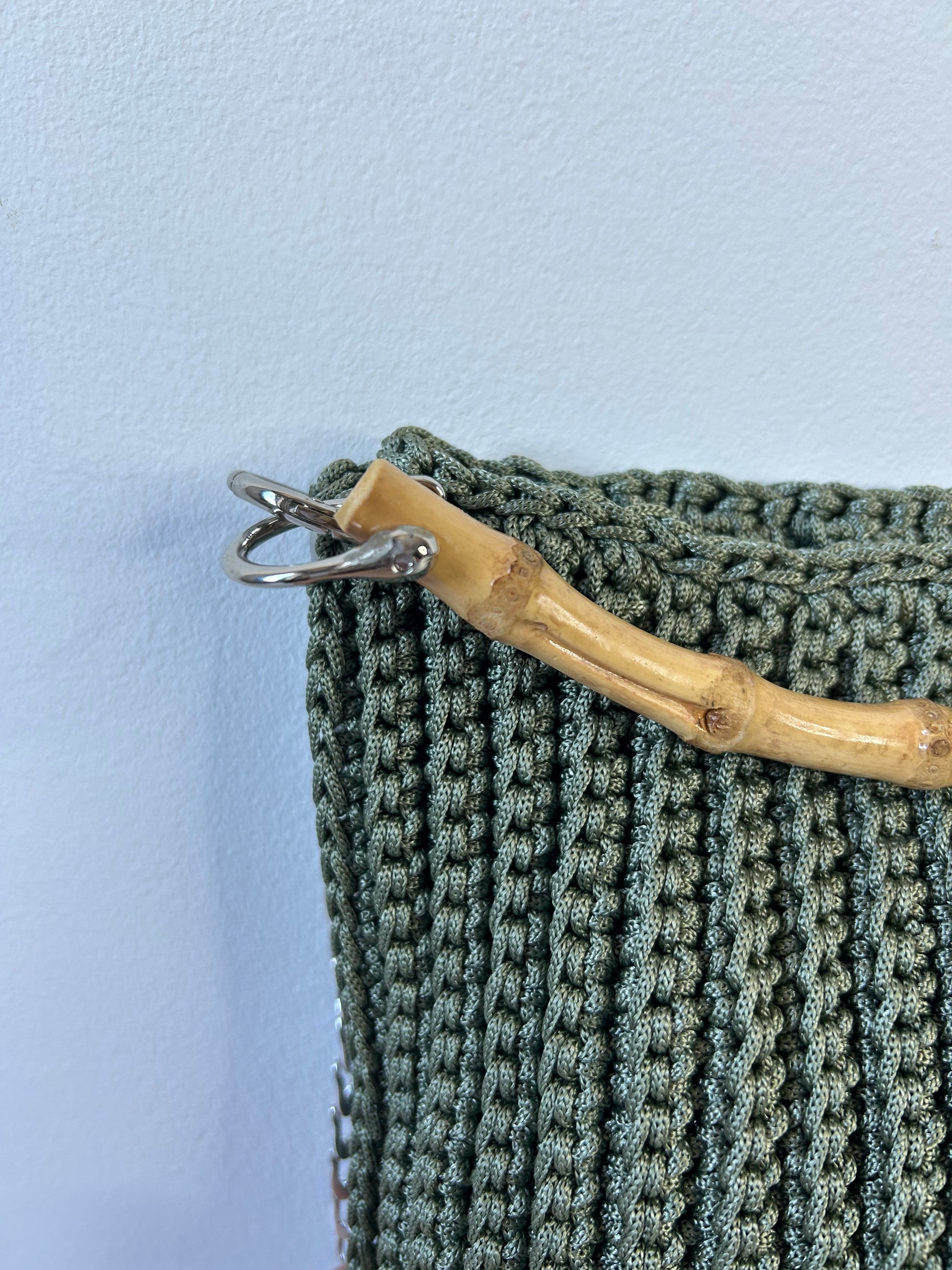 Borsa in cordino color verde, ispirata agli uliveti che circondano il Garda. Il manico in bamboo aggiunge un dettaglio naturale e luminoso, richiamando uno stile mediterraneo sobrio e raffinato.